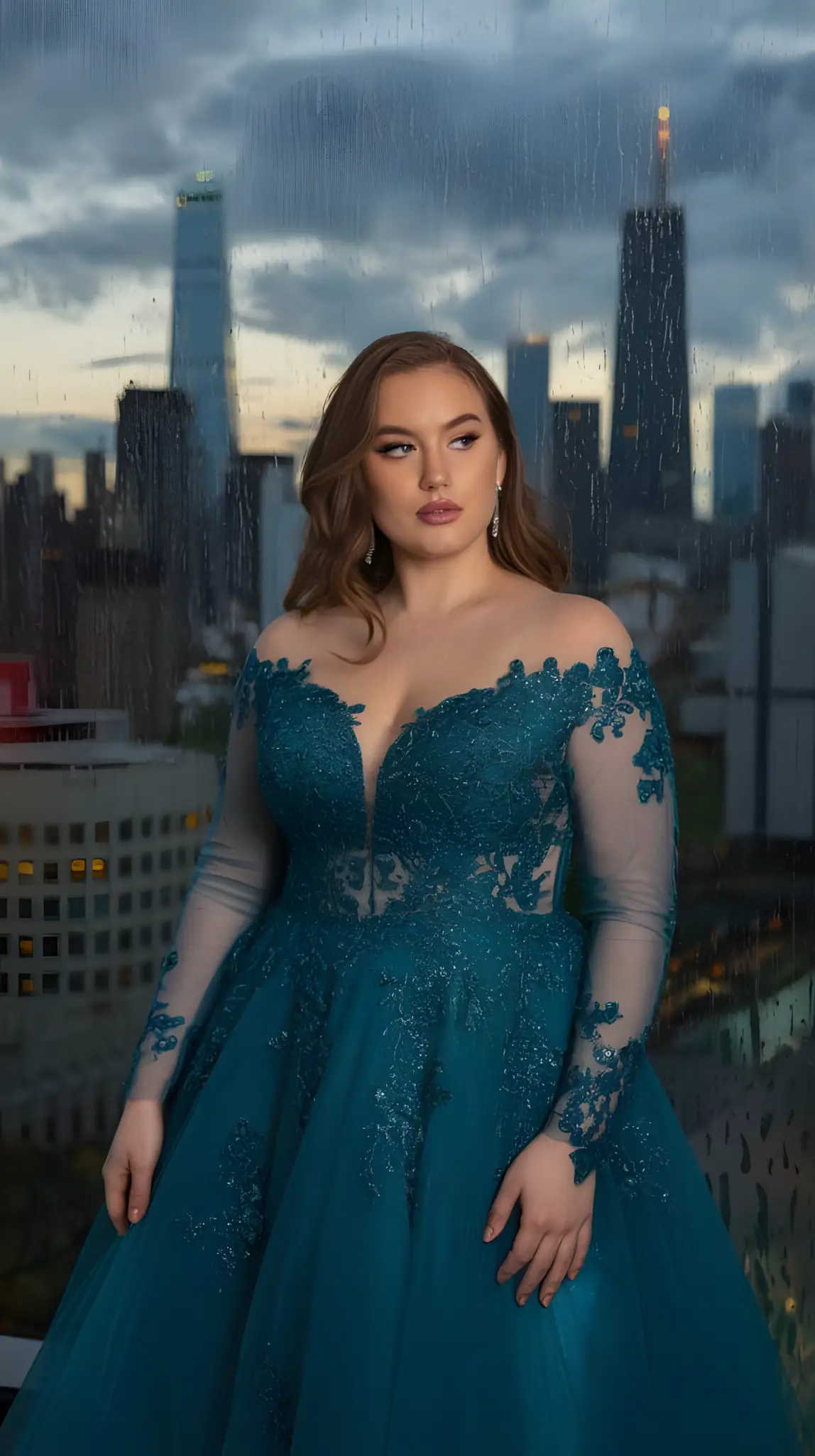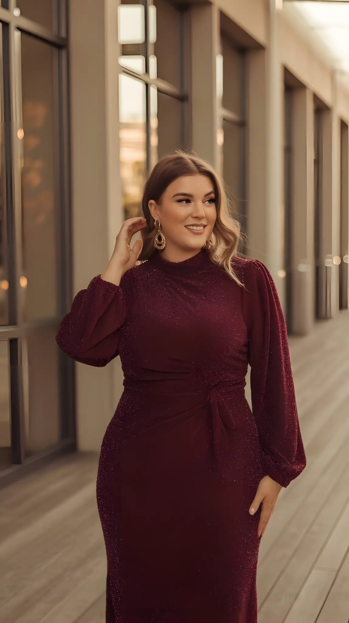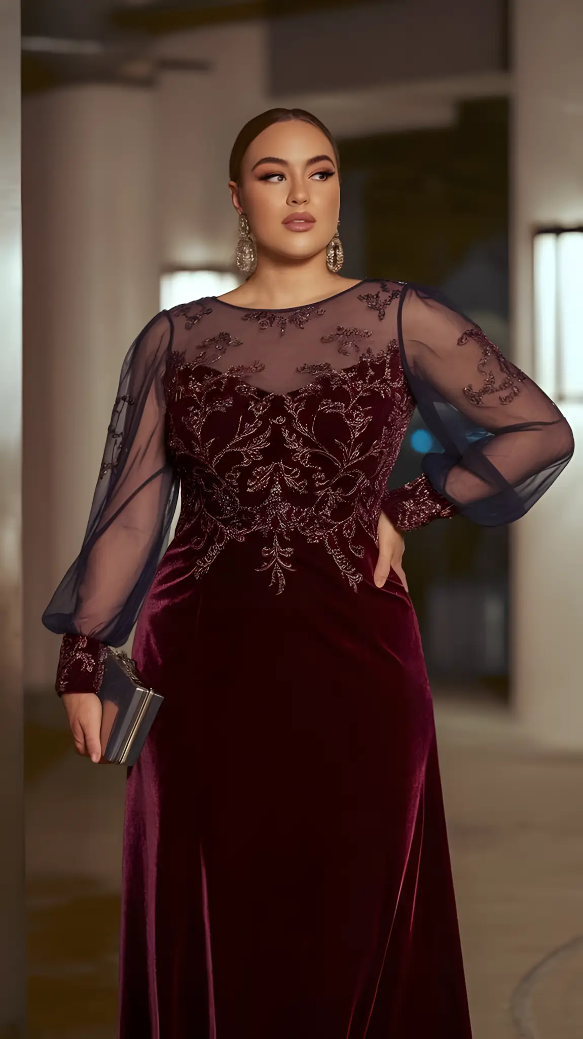 Sheer sleeves. A little mystery. Hugs your curves, but those sleeves? They tease. Theater night or a swanky dinner—perfect. Elegant jewelry, a clutch that gleams. You’re not just there; you’re there. Intriguing. Graceful. Unforgettable.