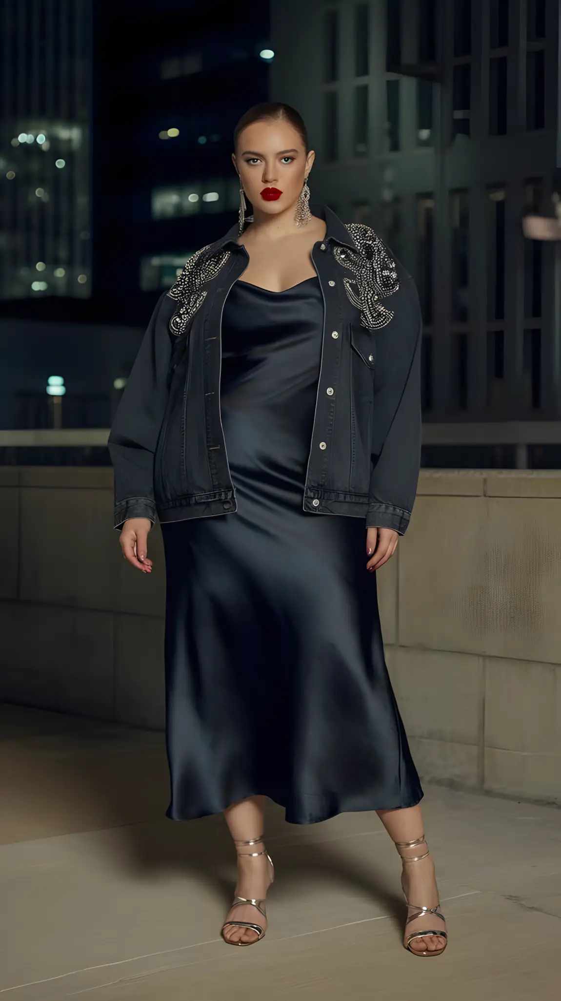 Denim. But glam. Studs, sequins, something extra. Over a sleek dress or bold top—casual meets chic. Movie date? Dive bar? Roll those sleeves, add some bling. You’re cool without even trying. Relaxed. Stylish. You.