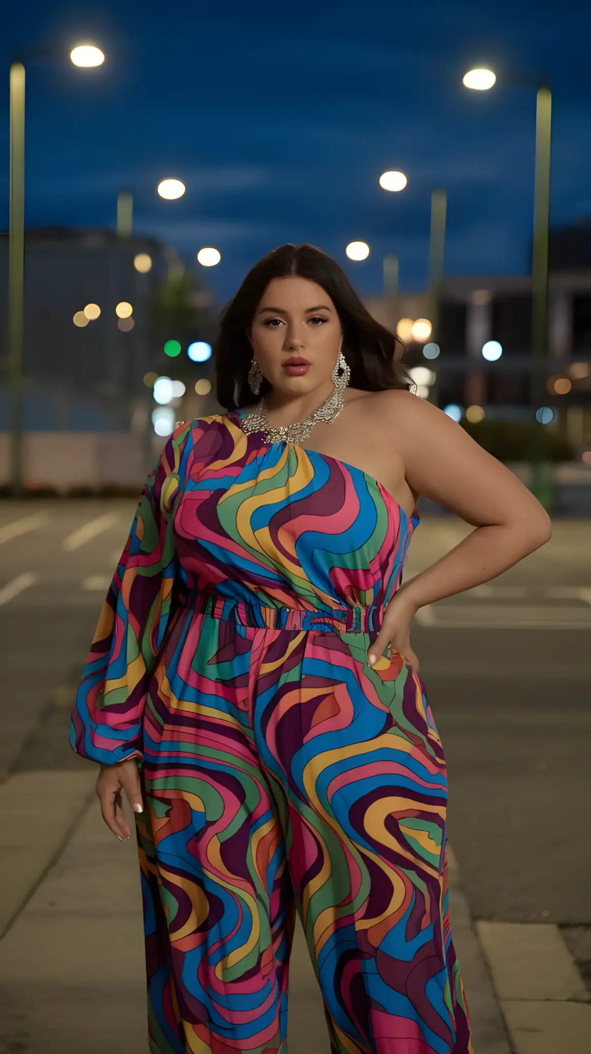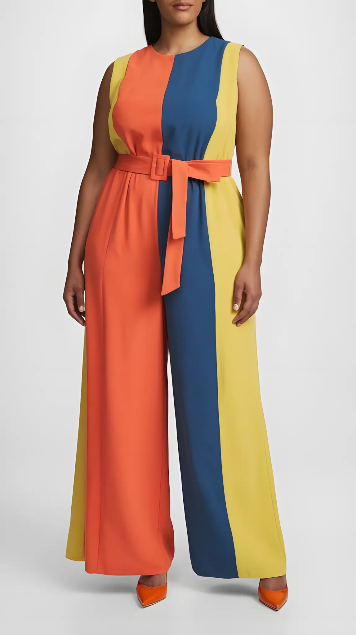 Color blocking. Art. Bold hues, sharp lines. Gallery opening or trendy spot—this jumpsuit’s a masterpiece. Keep accessories simple—it’s already talking. Heels to stretch that silhouette. You’re not just dressed; you’re painted. Artistic. Striking. Unforgettable.