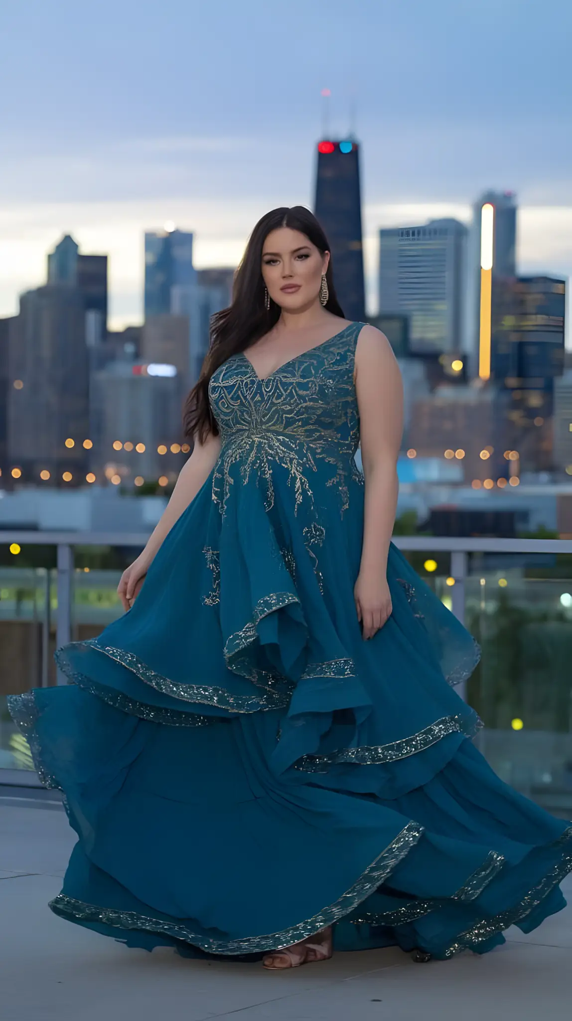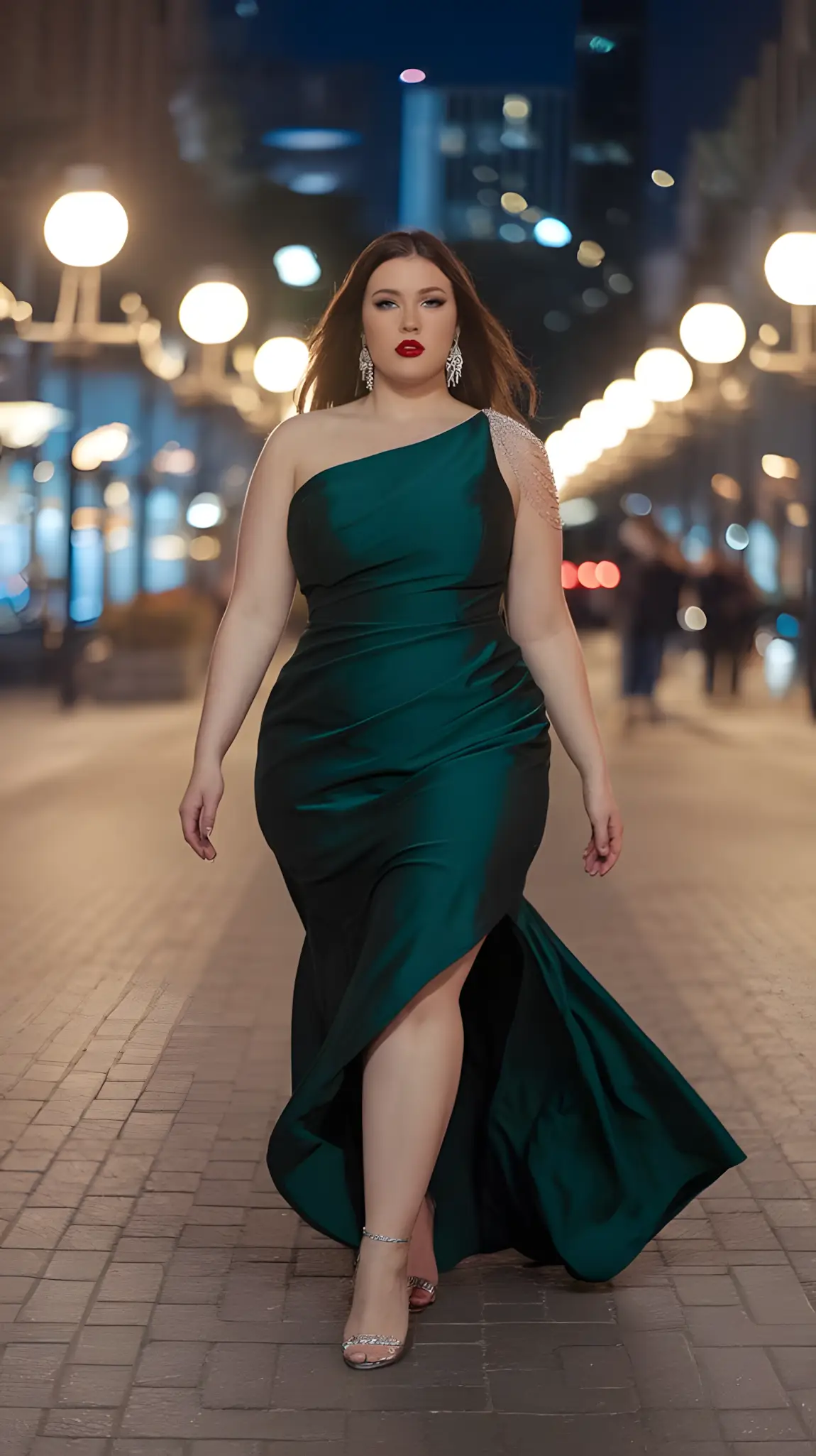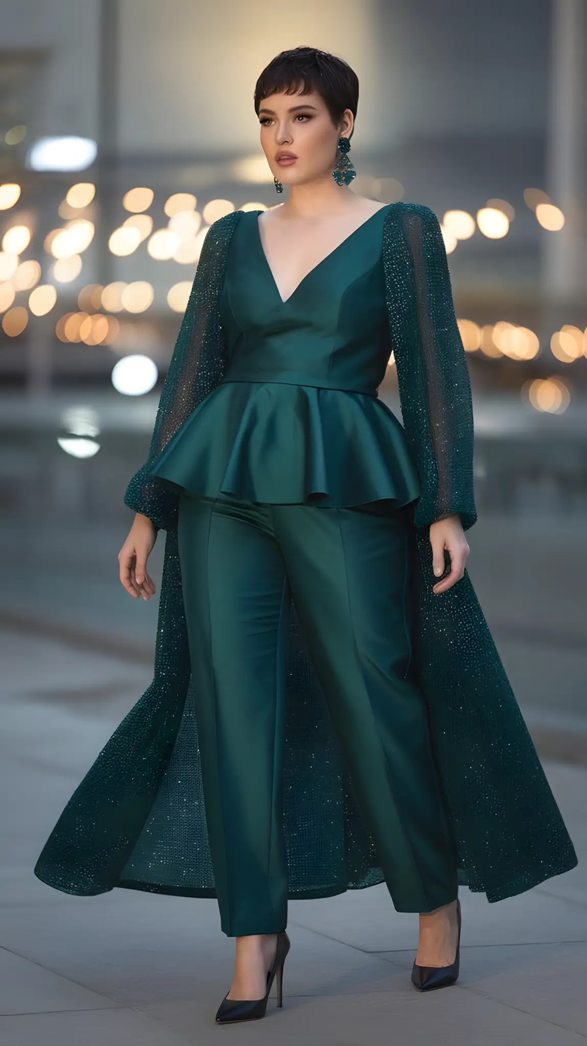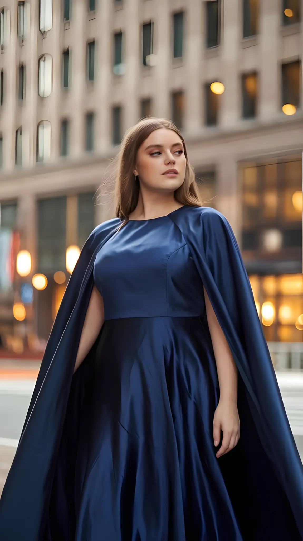 Cape. Theatrical. Flows like you’re a superhero. Big night, big entrance. Heels, jewelry that pops. You’re not just there; you’re dramatic. Confident. Stunning. Unforgettable.