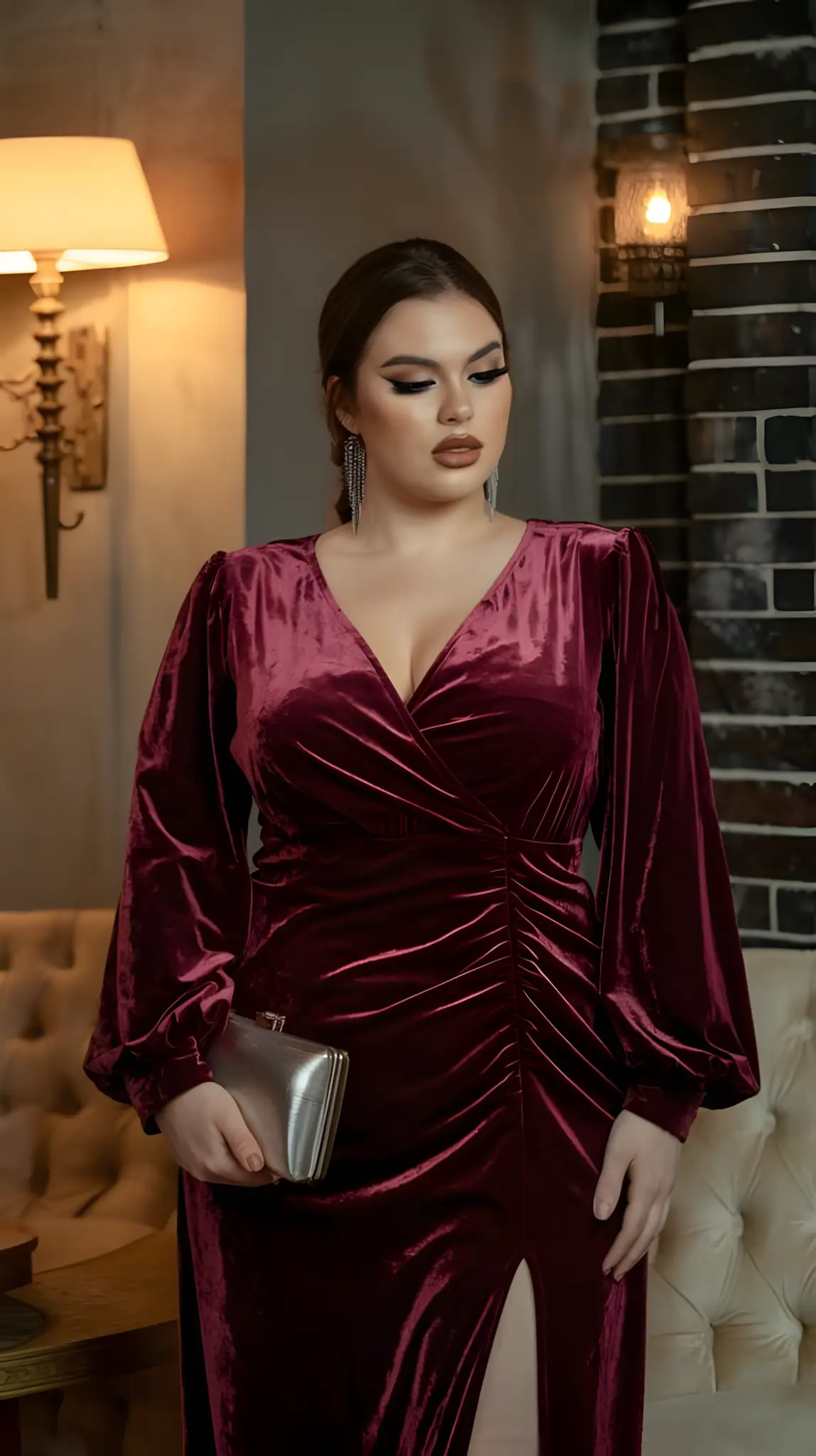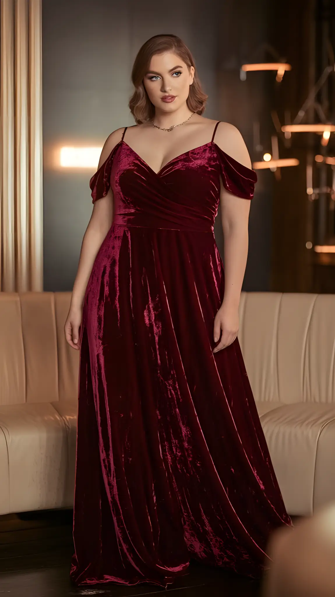 Velvet. Oh, honey, it’s lush. Soft as a whisper, rich as a queen’s ransom. Wraps you up, cinches that waist, flows over your hips like a dream. Perfect for a night where you want elegance without the fuss. Ankle boots, a smokey eye—maybe a bold lip if you’re feeling it. You’re not just dressed; you’re royalty.