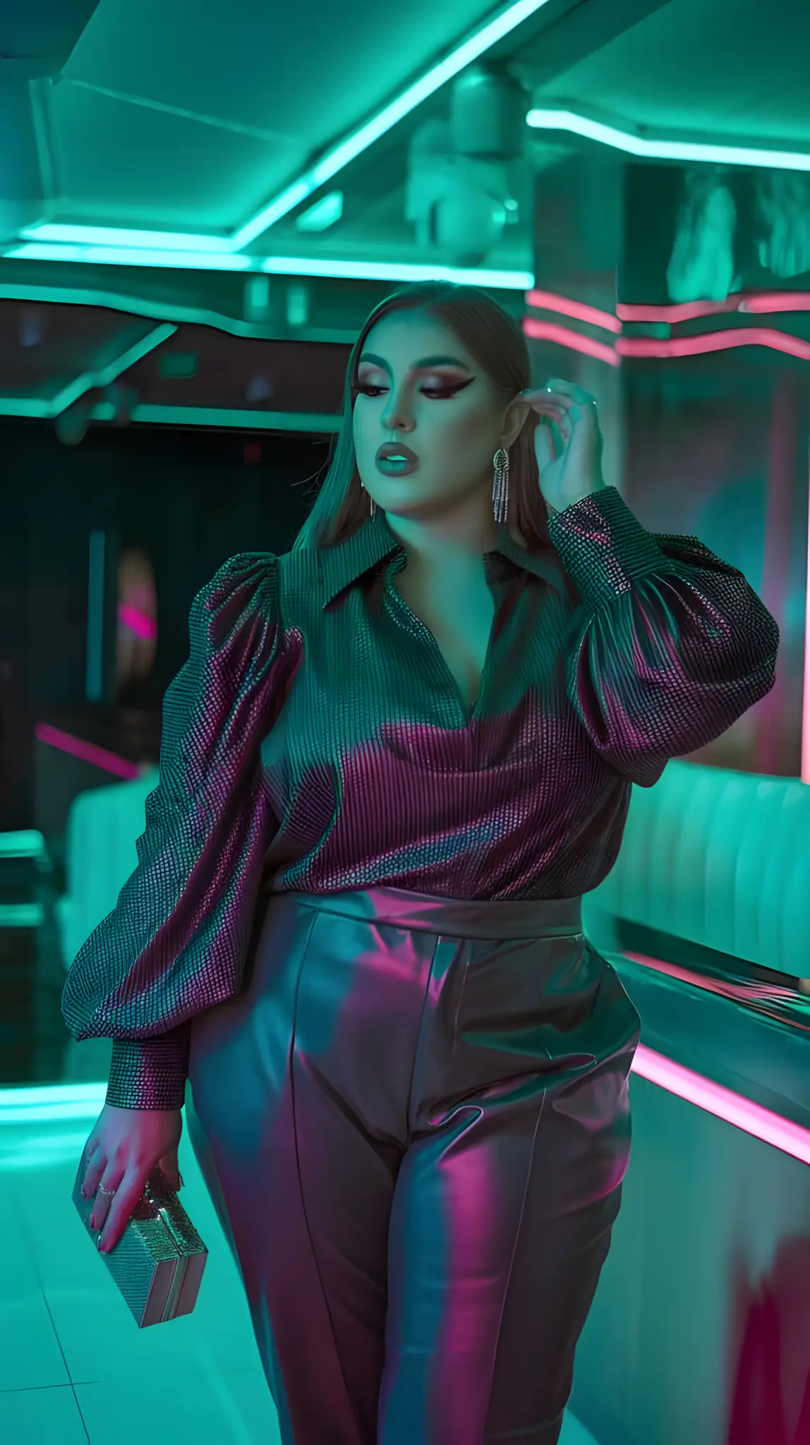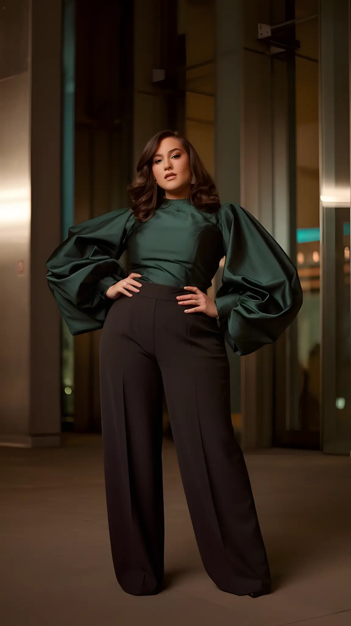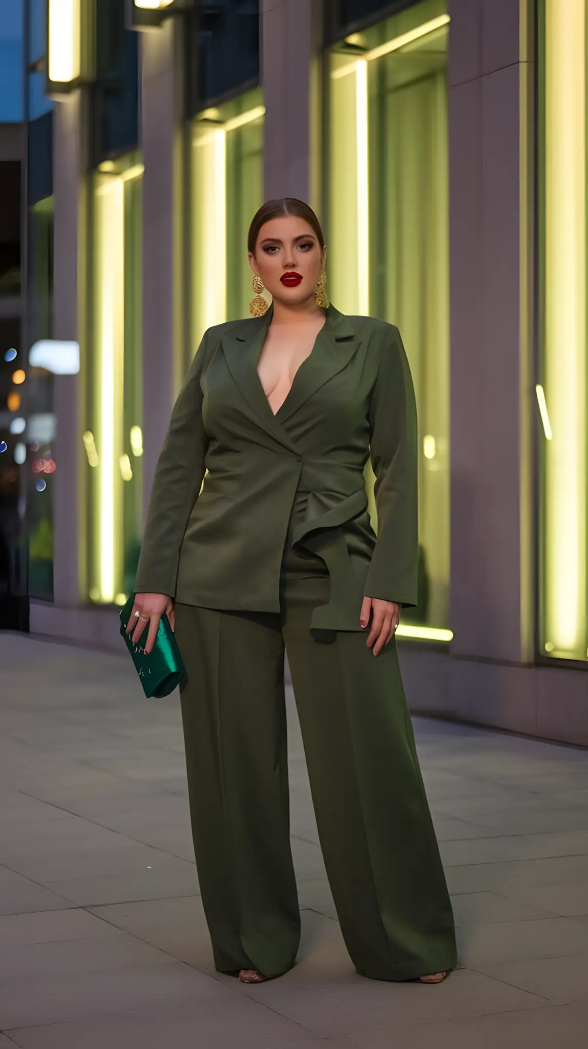 Wide legs. Power. Pantsuit that screams I’ve got this. Dinner or dominance—your choice. Heels, a clutch. You’re not just dressed; you’re commanding. Stylish. Bold. You.