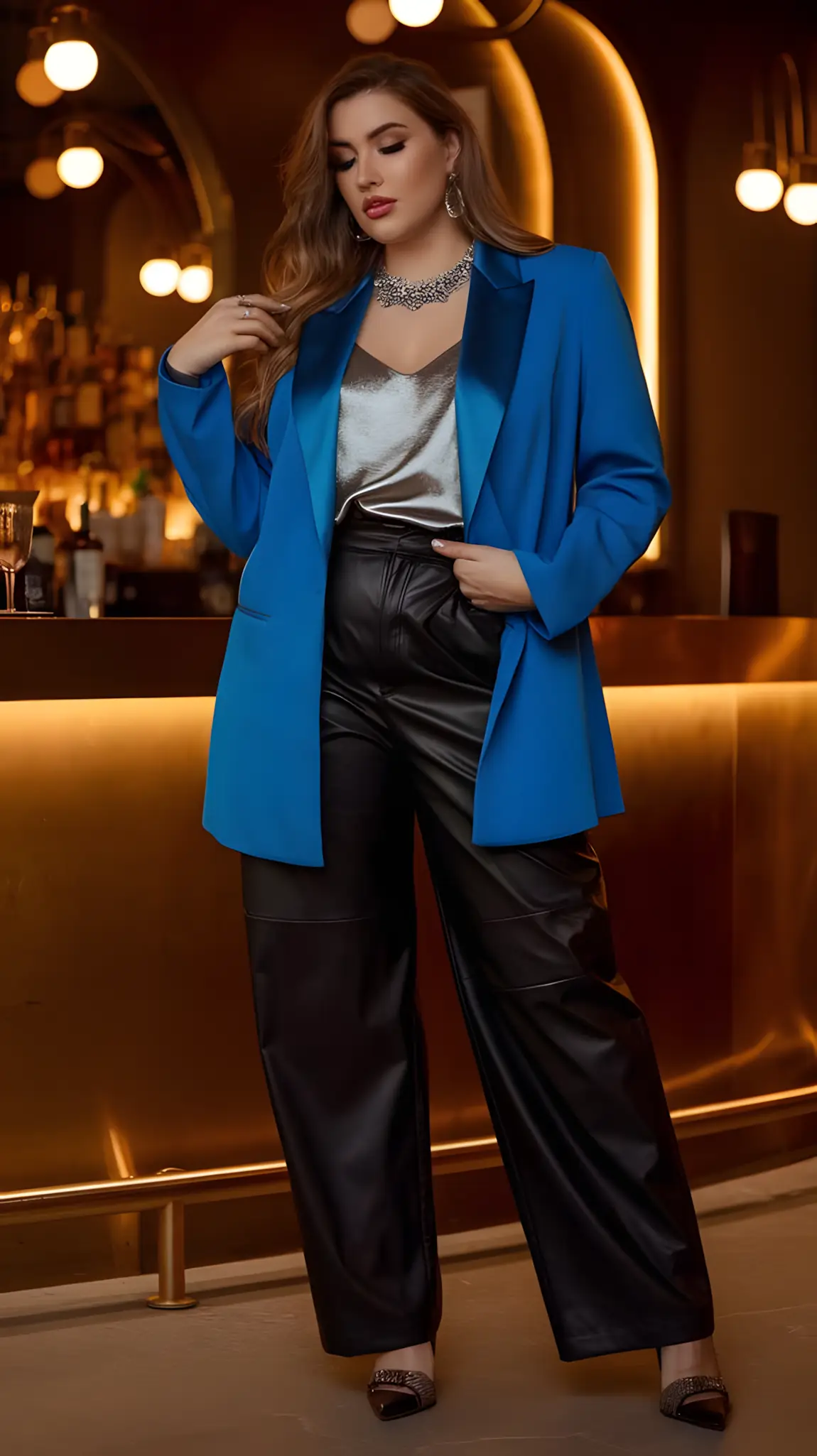 Leather leggings. Edgy. That slick, cool feel against your legs. Paired with an asymmetrical top—playful but fierce. Tough meets chic. Ankle boots, a swipe of bold lip color. You’re strutting into that bar like you own it. Modern. Sleek. Unstoppable.